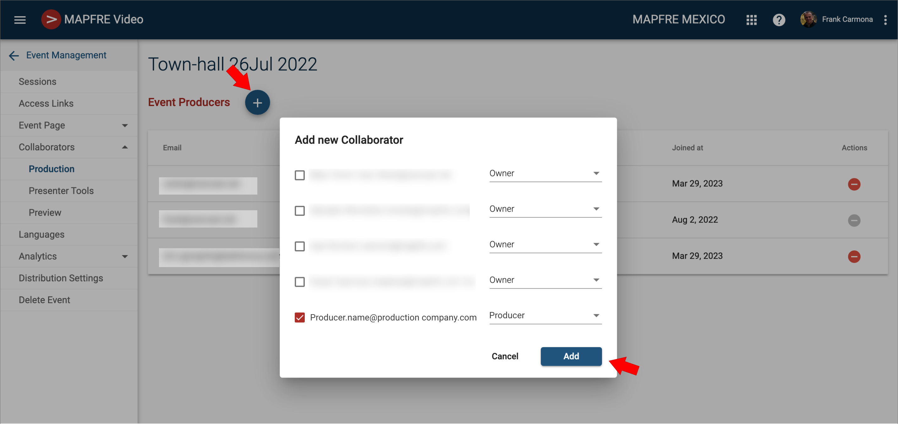 Check your producer's email and choose the role "Producer". Then click on the Add button.
