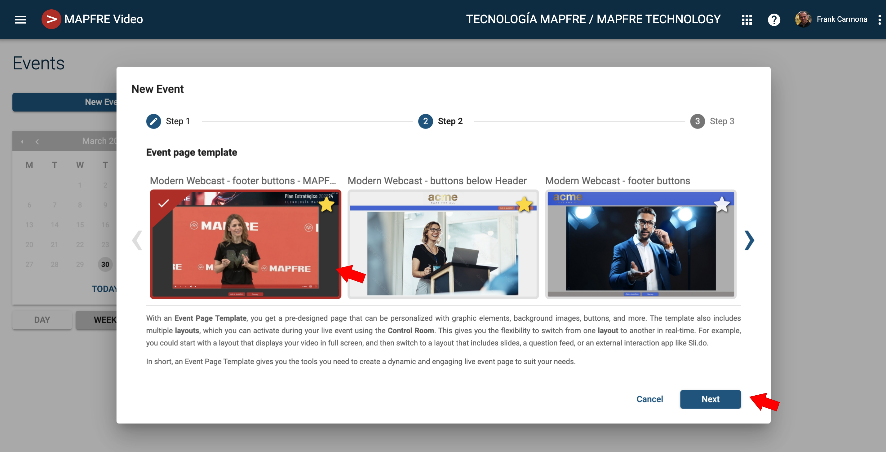 On the next step of the wizard, choose the Event page template you want to use. In this example we've chosen a specifically customized for MAPFRE template: "Modern Webcast - footer buttons - MAPFRE"